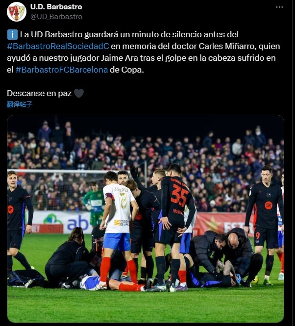 巴薩隊醫米尼亞羅近日不幸去世,而在今年1月初的國王杯比賽中,巴薩客場4-0戰勝了巴巴斯托,當時比賽第52分鐘,巴巴斯托球員海梅與伊尼戈發生了頭部碰撞,米尼亞羅則在場上為暈倒的海梅提供了傷口處理與醫療救助。