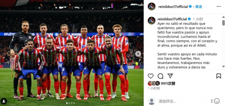 馬競(jìng)球員雷尼爾多本場(chǎng)首發(fā)出戰(zhàn),他在個(gè)人社媒曬出全隊(duì)賽前合影,配文寫道:“昨天我們沒有得到想要的結(jié)果,但是我們從沒有缺少球迷的熱情和無條件的支持。我們一如既往拼搏到了最后一刻,因?yàn)槲覀兪邱R競(jìng)。感受到你們的支持讓我們更加強(qiáng)大,我們會(huì)再次站起來,努力拼搏,并再一次帶給你們應(yīng)得的快樂。感謝大家來到球場(chǎng)支持,無論順境還是逆境,讓我們一直團(tuán)結(jié)一致,加油馬競(jìng)!”