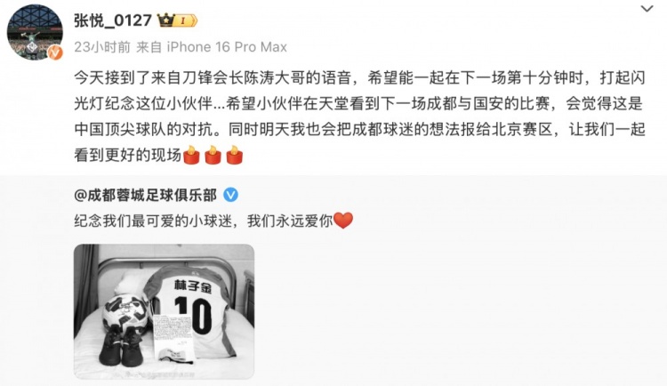 3月13日訊 得知小球迷林子金去世的消息后,國安御林軍球迷組織負責人張悅在社媒表達了他的悼念。昨天,成都蓉城官方發布訃告,小球迷林子金不幸去世。張悅在社媒悼念寫道:今天接到了來自刀鋒會長陳濤大哥的語音,希望能一起在下一場第十分鐘時,打起閃光燈紀念這位小伙伴…希望小伙伴在天堂看到下一場成都與國安的比賽,會覺得這是中國頂尖球隊的對抗。同時明天我也會把成都球迷的想法報給北京賽區,讓我們一起看到更好的現場。 本文標簽: 足球 中超 中國足球 成都蓉城 北京國安