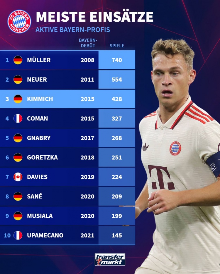 3月13日訊 拜仁今日官宣與基米希續(xù)約至2029年,據(jù)德轉(zhuǎn)數(shù)據(jù)統(tǒng)計(jì),基米希截至目前代表拜仁在各項(xiàng)賽事出戰(zhàn)428場(chǎng)比賽,在拜仁現(xiàn)役球員中排名第三,穆勒、諾伊爾排在前二。