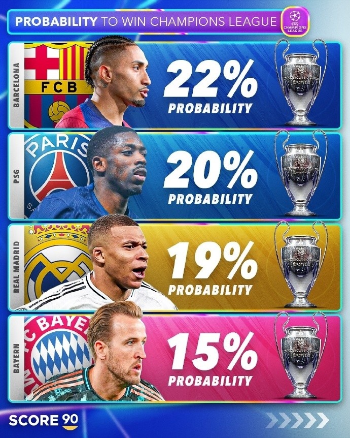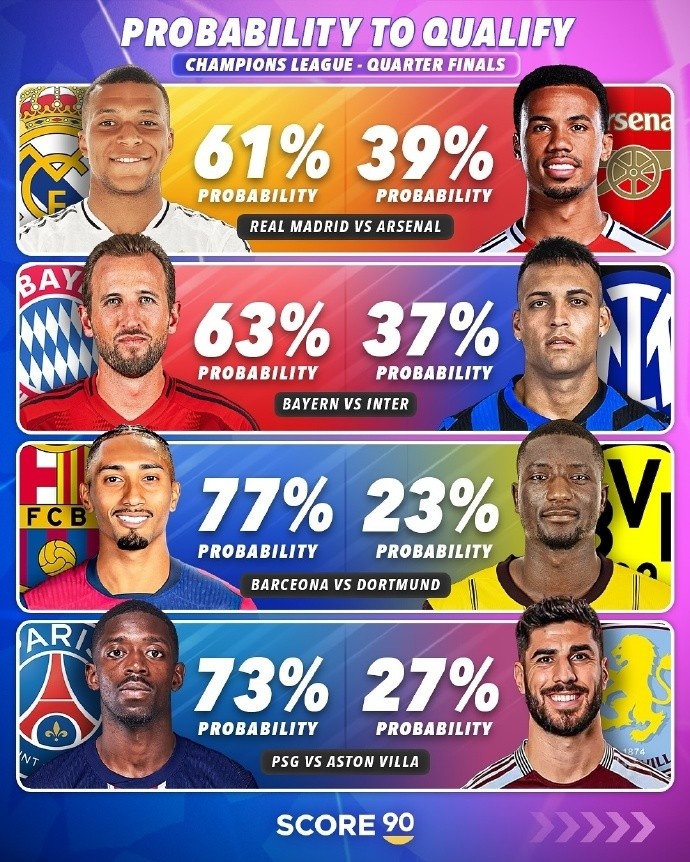 3月13日訊 歐冠1/4決賽賽程出爐后,外媒Score90也公布了各隊晉級概率和奪冠概率。