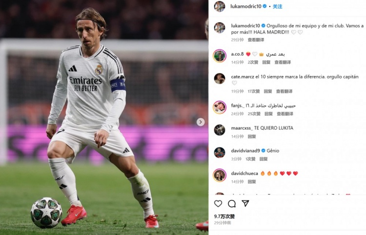 莫德里奇曬出自己的比賽照并配文:“我為我的球隊(duì)和俱樂部感到驕傲。讓我們繼續(xù)贏得更多!!!馬德里前進(jìn)!!!”