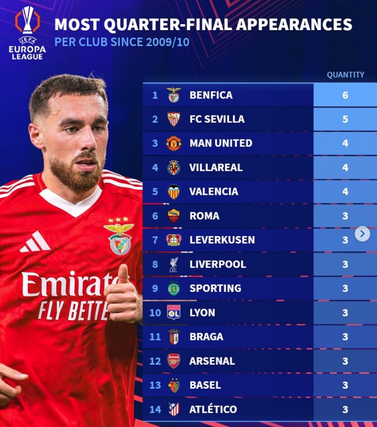 3月14日訊 歐聯杯16強戰戰火重燃,《轉會市場》也統計了自09-10賽季改制后的歐聯杯晉級八強次數情況,塞維利亞屈居次席。歐聯改制后晉級八強次數榜:6次,本菲卡5次,塞維利亞4次,曼聯、比利亞雷亞爾、瓦倫西亞3次,羅馬、勒沃庫森、利物浦、葡體、里昂、布拉加、阿森納、巴塞爾、馬競 本文標簽: 足球 歐聯杯 葡超 西甲 塞維利亞 英超 曼聯 利物浦 比利亞雷亞爾 瓦倫西亞 意甲 羅馬 德甲 勒沃庫森 法甲 里昂 阿森納 馬德里競技