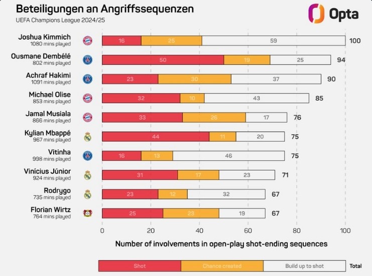 3月14日訊 拜仁官方宣布基米希與球隊續約,數據網站OPTA統計,基米希是本賽季歐冠運動戰參與形成射門進攻次數最多的球員,具體榜單如下(射門+創造機會+組織形成射門的進攻):1、基米希 100次2、登貝萊 94次3、阿什拉夫 90次4、奧利塞 85次5、穆西亞拉 76次6、姆巴佩 75次7、維蒂尼亞 75次8、維尼修斯 71次9、羅德里戈 67次10、維爾茨 67次 本文標簽: 足球 德甲 拜仁慕尼黑