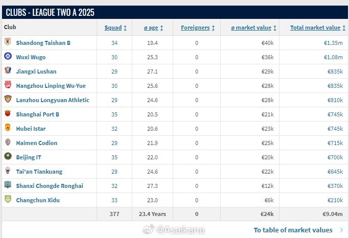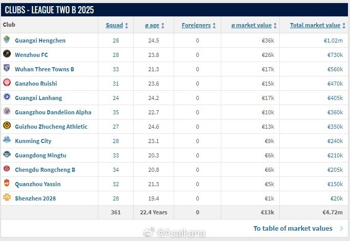 2025賽季中乙各隊名單已在轉會市場網更新。球隊總身價方面,山東泰山B隊以135萬歐元列第一,后面依次是無錫吳鉤(108萬歐)、廣西恒宸(102萬歐)、江西廬山(83.5萬歐)、杭州臨平吳越(83.5萬歐)、蘭州隴原競技(81萬歐)、上海海港B隊(74.5萬歐)、湖北青年星(74.5萬歐)、溫州(73萬歐)、南通海門珂締緣(71.5萬歐)、北京理工(70萬歐)、泰安天貺(64.5萬歐)、武漢三鎮B隊(56萬歐)、贛州瑞獅(47萬歐)、廣西藍航(40.5萬歐)、山西崇德榮海(37萬歐)、廣州蒲公英(36萬歐)、貴州筑城競技(35萬歐)、昆明城市(24萬歐)、廣東銘途(21萬歐)、長春喜都(21萬歐)、成都蓉城B隊(20.5萬歐)、泉州亞新(15萬歐)、深圳二零二八(2萬歐)。