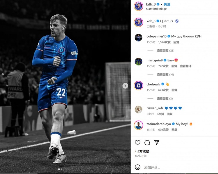 3月14日訊 切爾西在昨晚的歐協聯16強戰次回合主場1-0小勝哥本哈根,霍爾打進制勝球。第54分鐘,霍爾在左路弧頂連續內切過人到禁區,一腳低射破門。他也在賽后通過社媒曬出自己的慶祝照并配文:“晉級八強!??”而帕爾默、吉烏、阿達拉比奧尤等隊友也紛紛現身評論區鼓勵:“我的兄弟”、“輕松!”、“我的棒小伙!”… 本文標簽: 足球 英超 切爾西