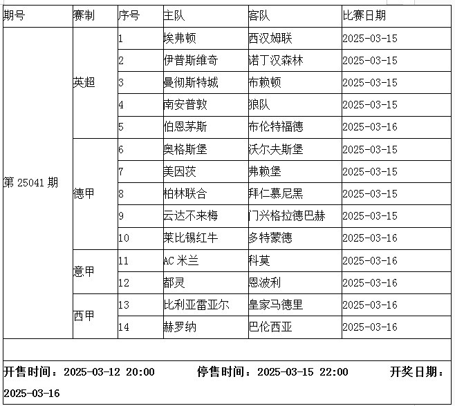 本周末的 傳足勝負彩第25041期中不乏焦點:英超,曼城主場對陣布賴頓;德甲,拜仁慕尼黑客場出征柏林;意甲,AC米蘭主場迎戰科莫;西甲,皇馬做客對壘比利亞雷亞爾。