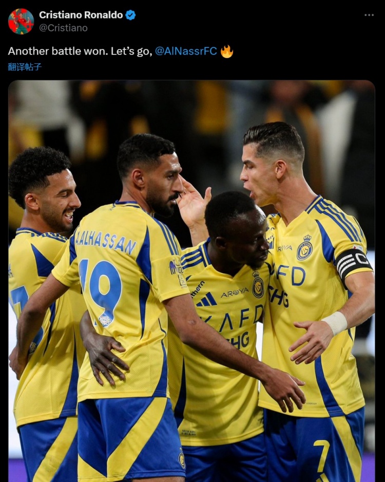 3月15日訊 利雅得勝利在本輪沙特聯3-1擊敗卡赫胡德,C羅打進1球并策動1球。第4分鐘,布羅佐維奇前場搶斷,馬內下底傳向門前,杜蘭轉身掃射被門將哥希擋出,C羅順勢補射彈柱入網。第26分鐘,C羅中場左腳直塞策動,納吉迪左路傳中,馬內包抄凌空墊射得手。數據統計顯示這也是C羅生涯第928球,他也在賽后通過社媒曬出和隊友的慶祝照并配文:“又贏下一場戰斗,讓我們繼續前進!@利雅得勝利俱樂部”。 本文標簽: 足球 C羅 利雅得勝利 五洲