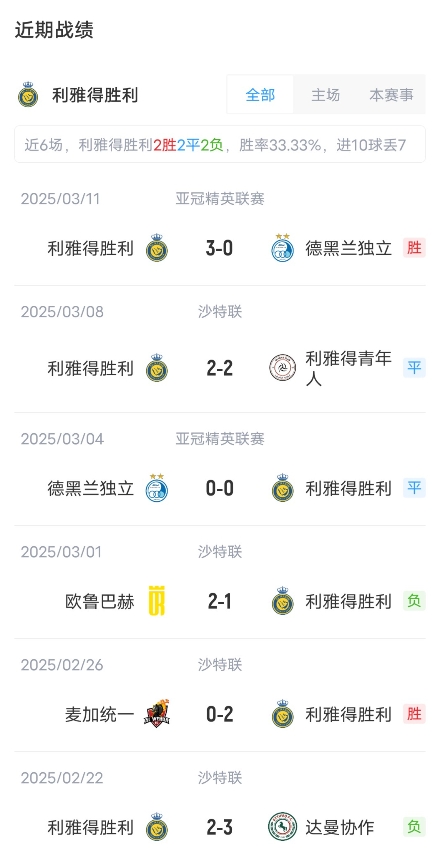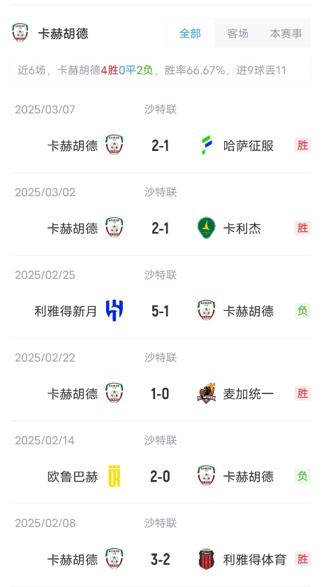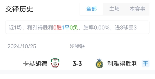 目前利雅得勝利取得了14勝6平4負的成績,積48分,暫居聯賽第4??ê蘸氯〉昧?勝4平11負成績,積31分,暫居聯賽第10。