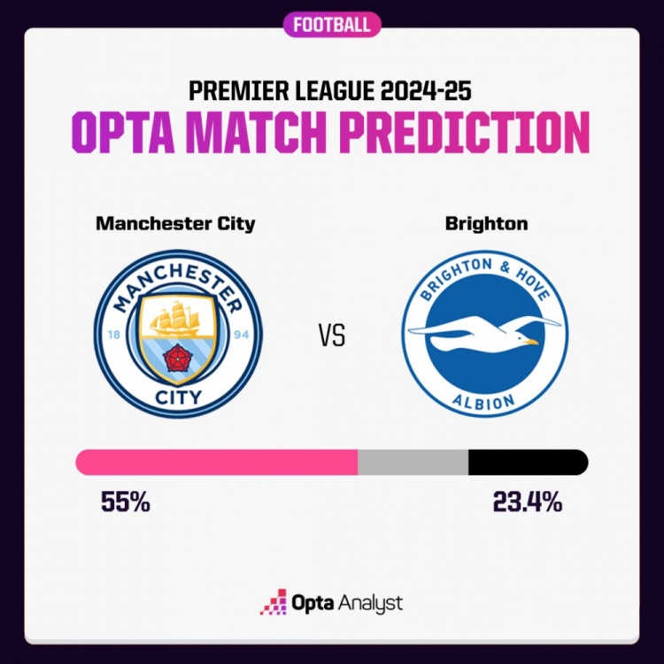 Opta對于本場比賽進行了超級計算機模擬預測,曼城獲勝概率55%,布萊頓獲勝概率23.4%,雙方戰平概率21.7%。