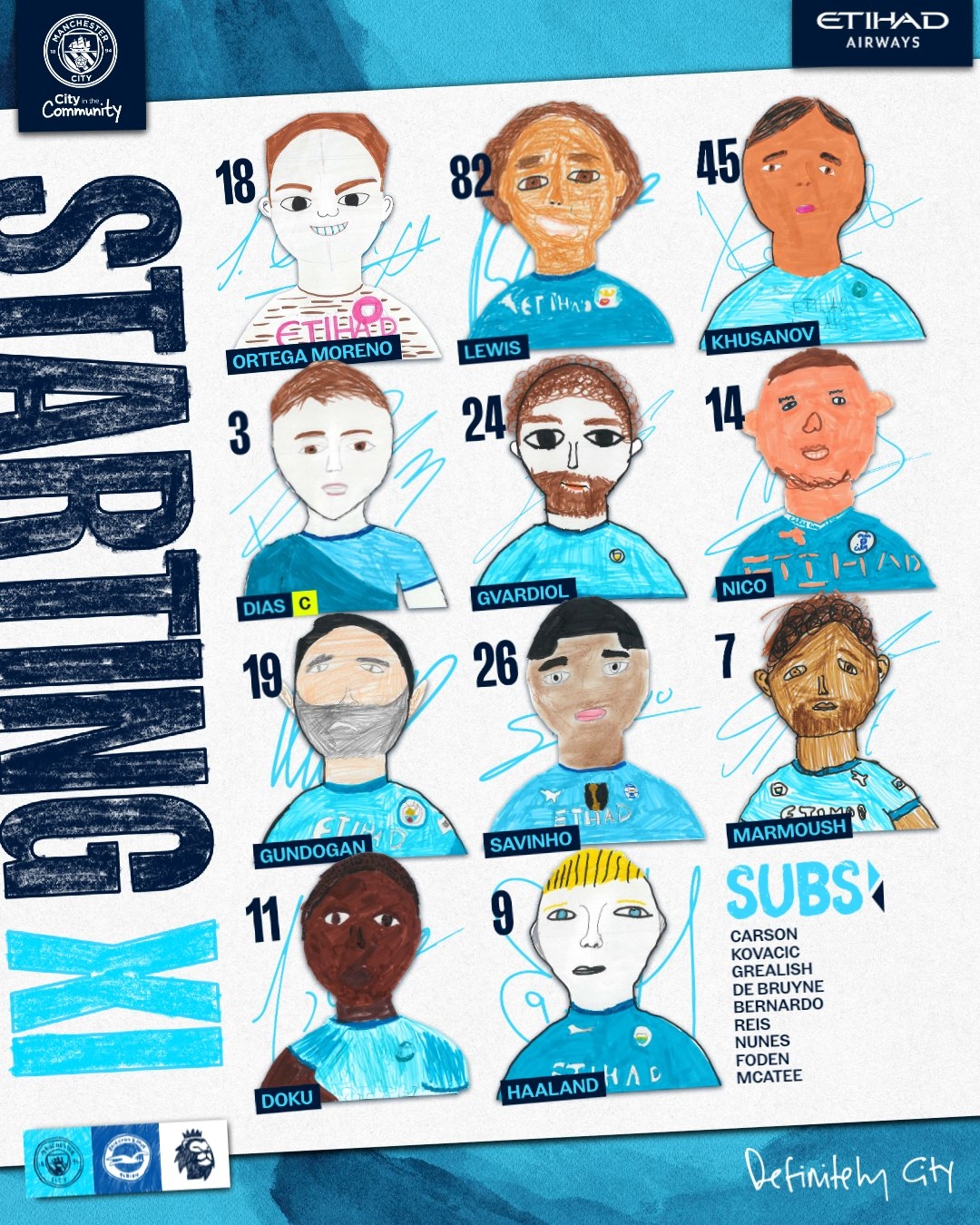 曼城首發:18-奧爾特加、3-魯本-迪亞斯、24-格瓦迪奧爾、45-胡桑諾夫、82-劉易斯、14-尼科-岡薩雷斯、19-京多安、7-馬爾穆什、9-哈蘭德、11-多庫、26-薩維尼奧