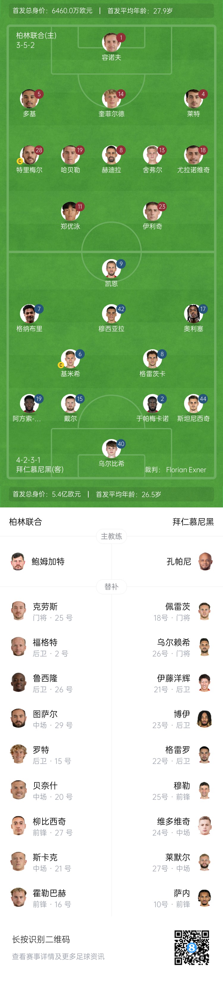 柏林聯合首發:1-容諾夫、4-萊特、5-多基、14-奎菲爾德、18-尤拉諾維奇、8-拉尼-赫迪拉、13-舍費爾、11-鄭優泳、19-哈貝勒、28-特里梅爾、23-伊利奇