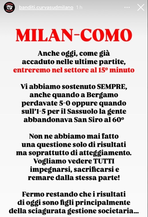 3月15日訊 米蘭南看臺(tái)發(fā)文,表示將在本輪對(duì)陣科莫的意甲聯(lián)賽繼續(xù)抗議。