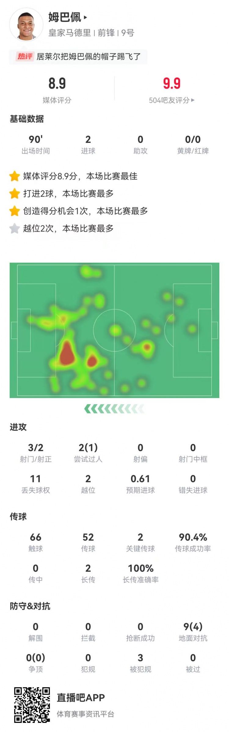 3月16日訊 皇馬在本輪西甲2-1逆轉黃潛,姆巴佩本場數據如下:首發踢滿全場2球預期進球0.613射門、2射正2過人、1成功66觸球52傳球、47成功,成功率90%2關鍵傳球2長傳、2成功1創造重大機會9對抗、4成功11丟失球權3造犯規2越位獲評8.9分全場最高 本文標簽: 足球 西甲 皇家馬德里 比利亞雷亞爾 姆巴佩