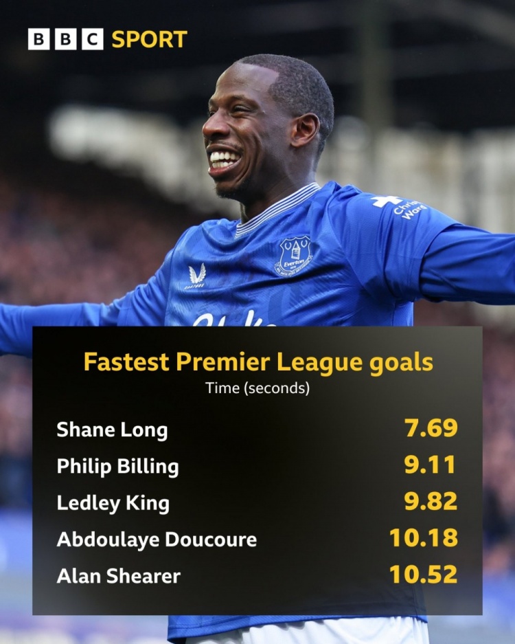 2月1日訊 埃弗頓在本輪英超對(duì)陣萊斯特城,杜庫(kù)雷開(kāi)場(chǎng)閃擊破門,數(shù)據(jù)統(tǒng)計(jì)顯示這也是英超歷史第4快進(jìn)球。
