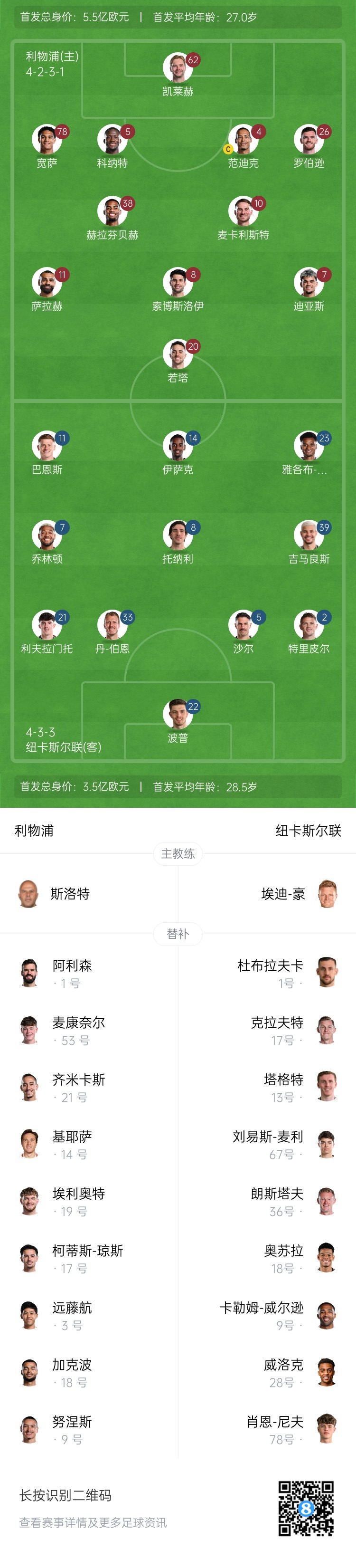 利物浦首發:62-凱萊赫、78-寬薩、5-科納特、4-范迪克、26-羅伯遜、38-赫拉芬貝赫、8-索博斯洛伊、10-麥卡利斯特、11-薩拉赫、7-迪亞斯、20-若塔
