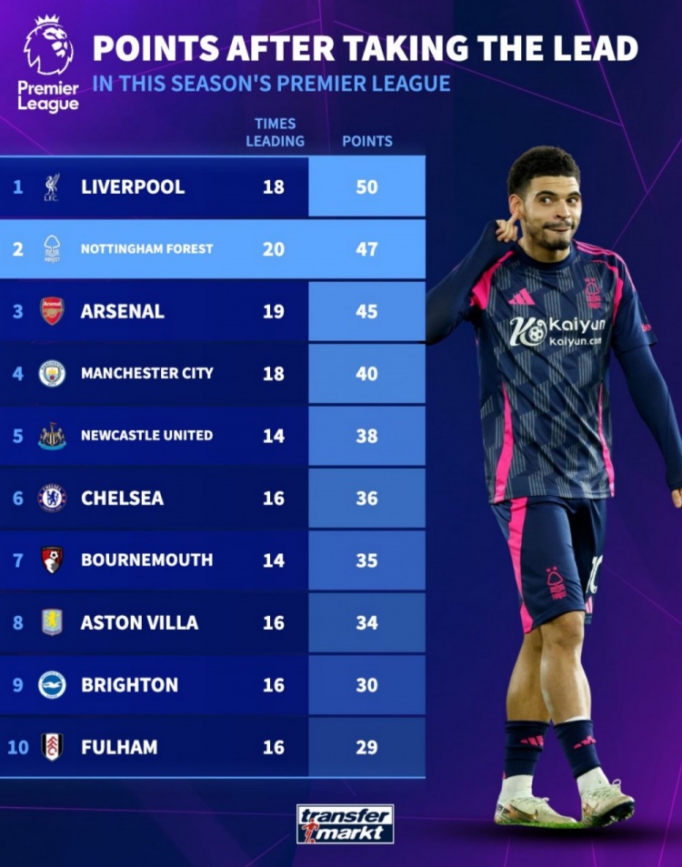 據統計,本賽季英超至今,森林在比賽中取得領先的情況下最后拿到了47個積分,是第二多的球隊,僅次于利物浦。