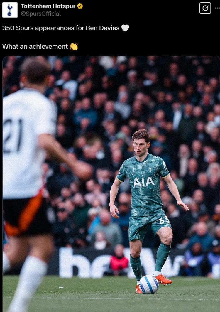 3月16日訊 在本輪英超熱刺對陣富勒姆的比賽中,本-戴維斯為熱刺首發登場。本場比賽也是本-戴維斯生涯代表熱刺各項賽事第350次登場,球隊官推也曬照為其紀念,配文寫道:“多么了不起的成就!”本-戴維斯自14/15賽季開始效力熱刺,這名31歲后衛在此前的比賽為球隊貢獻9球23助攻。 本文標簽: 足球 英超 熱刺