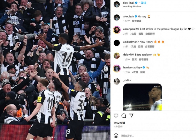 3月17日訊 紐卡在聯賽杯決賽2-1擊敗利物浦,時隔70年再次奪冠,進球功臣伊薩克也在賽后通過社媒慶祝。第53分鐘,利夫拉門托與巴恩斯配合后送出傳中,后點墨菲頭球擺渡,伊薩克跟進破門。伊薩克曬出了自己的霸氣慶祝照,并配文:“創造歷史!” 本文標簽: 足球 英超 利物浦 紐卡斯爾聯
