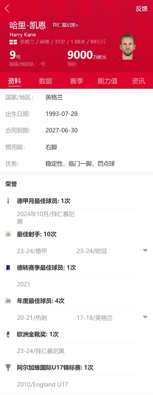 現年31歲的凱恩職業生涯攻入400多粒進球、斬獲數十項個人榮譽,但至今還未隨球隊奪得過主要賽事冠軍。