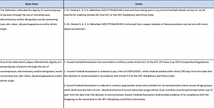 3月17日訊 2024年10月25日U17亞洲杯預選賽科威特對陣澳大利亞的比賽中,科威特球員米沙勒因種族歧視行為被亞足聯處罰。亞足聯確認米沙勒在比賽中使用了種族歧視的行為及詆毀性言辭,侵犯了對方的尊嚴,因此對其做出了停賽6個月的處罰。若其再次違反相關規定,可能會受到更嚴厲的處罰。另外,科威特足協被勒令罰款1萬美元,罰款必須在30日內付清。亞足聯還要求科威特足協對其所有年齡段代表隊展開反種族歧視教育。 本文標簽: 足球 中超 中國足球