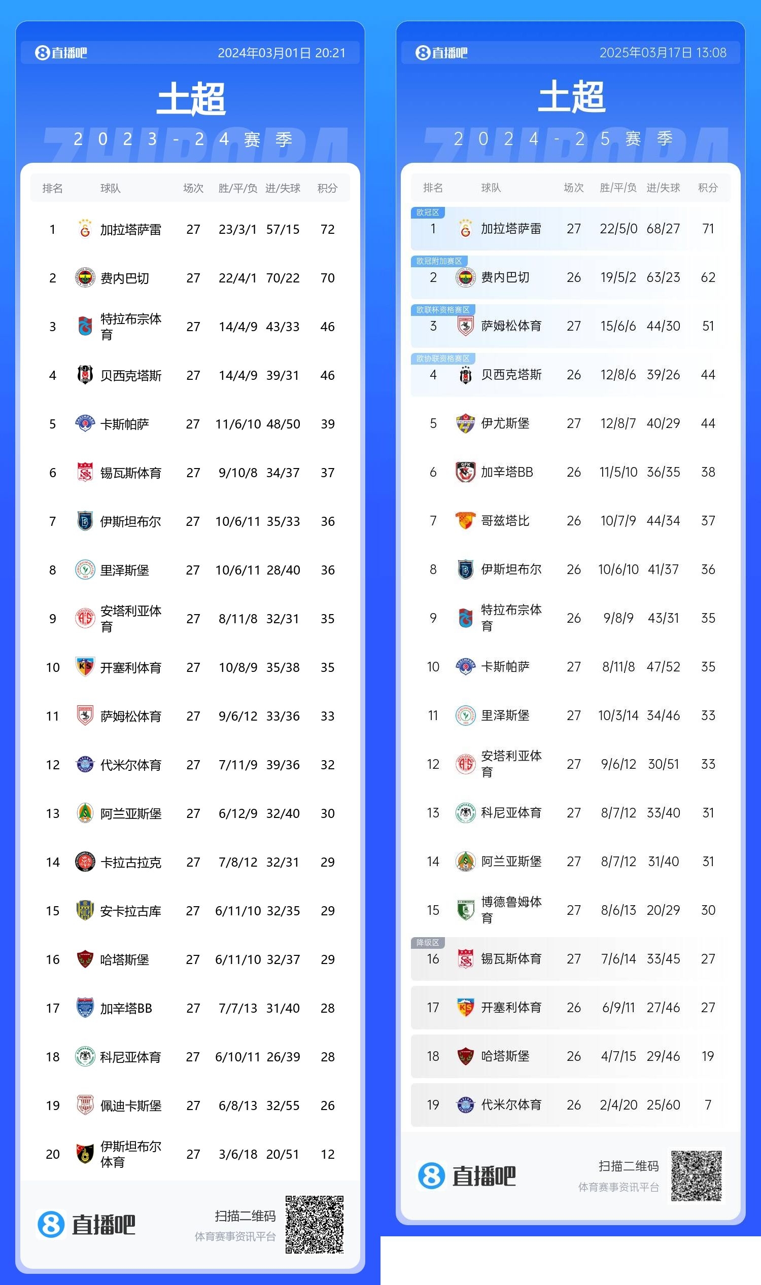 到了本賽季,加拉塔薩雷延續(xù)無敵的表現(xiàn),27場比賽后拿到71分,只比去年少1分,但費內(nèi)巴切卻有一些掉隊了。盡管目前費內(nèi)巴切少賽一場領先第3名也有11分之多,但落后榜首加拉塔薩雷已9分。今年費內(nèi)巴切的爭冠形式并不樂觀,二人轉的局面漸漸有些偏向獨角戲了…