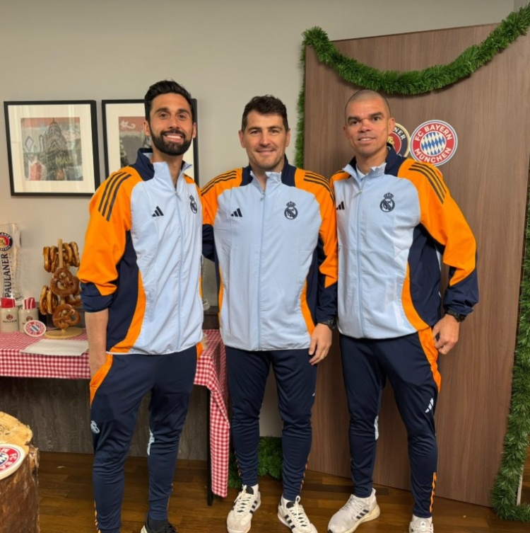 賽前,代表皇馬傳奇隊出戰的卡西、佩佩、阿韋羅亞合影留念,三人曾攜手幫助球隊拿到第10座歐冠冠軍。卡西現年43歲,出道于皇馬,2015年離隊;佩佩現年42歲,2007年-2017年效力皇馬;阿韋羅亞現年42歲,出道于皇馬,并于2009年-2016年回到皇馬效力。