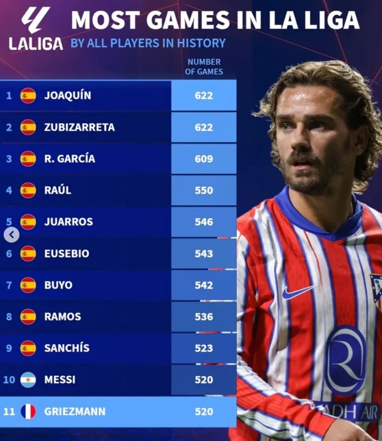 3月17日訊 馬競在本輪西甲焦點戰2-4被巴薩逆轉,格列茲曼達成“里程悲”。數據統計顯示,他在本場比賽達成西甲生涯520場出場,追平梅西,并列西甲歷史出場榜前十。