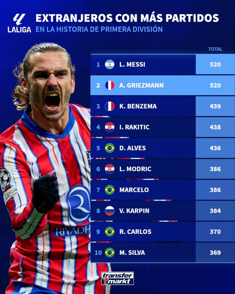 據(jù)德國轉(zhuǎn)會市場統(tǒng)計,此役過后,格列茲曼已出戰(zhàn)520場西甲比賽,與梅西并列排名西甲歷史外援出場榜首位。