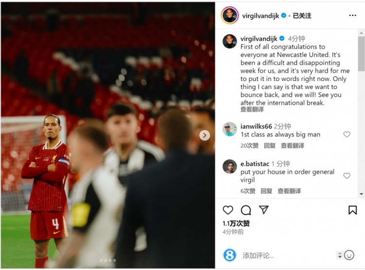3月17日訊 聯(lián)賽杯決賽,利物浦1-2不敵紐卡,無緣冠軍。利物浦隊長范迪克社媒曬出自己賽后失落的照片,并寫道:“首先祝賀紐卡的每個人。對我們來說,這是艱難而令人失望的一周,現(xiàn)在我很難用言語來表達感受。我唯一能說的是,我們希望重新振作,我們會的!國際比賽日后再見。” 本文標簽: 足球 英超 利物浦 范迪克