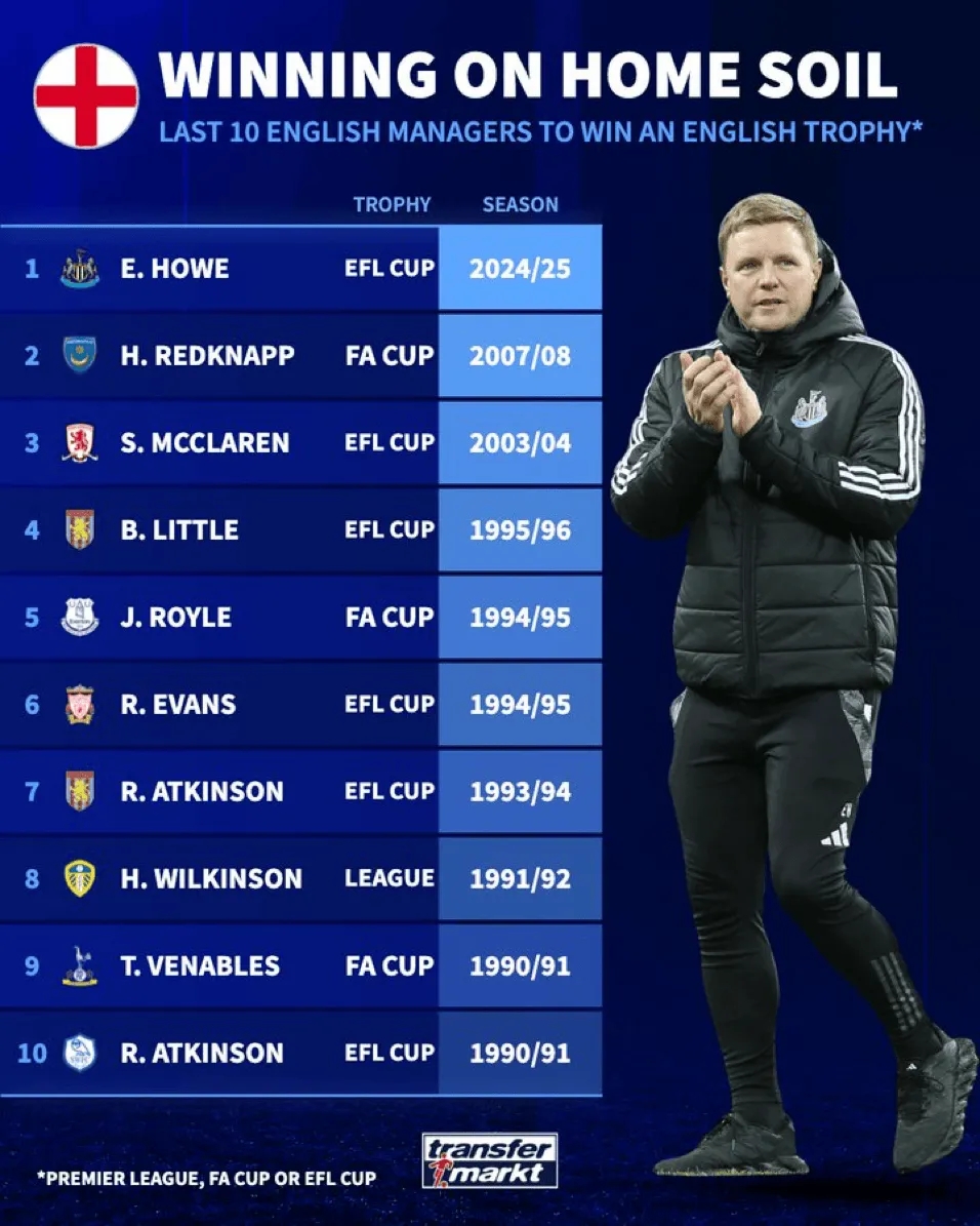 3月18日訊 紐卡在昨晚的聯賽杯決賽2-1擊敗利物浦,埃迪-豪也成為近年來首位帶隊捧得國內冠軍的英格蘭本土主帥。