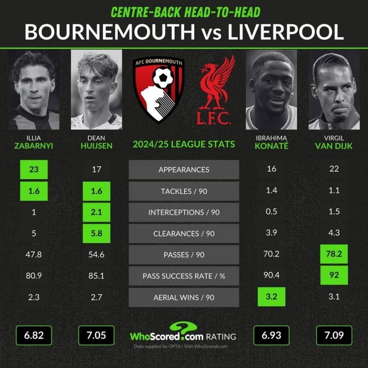 2月1日訊 利物浦在本輪英超將對陣伯恩茅斯,后者在本賽季表現出色以40分位列第7,距離英超第3也僅有4分差距,后防線的表現可圈可點。whoscored也對比了兩隊的四位中衛本賽季英超關鍵場均數據: