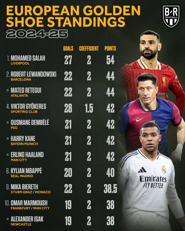 3月18日訊 B/R Fooball統計了本賽季球員的聯賽進球數量,并列出歐洲金靴排名,薩拉赫54分領跑,萊萬、雷特吉44分次席。