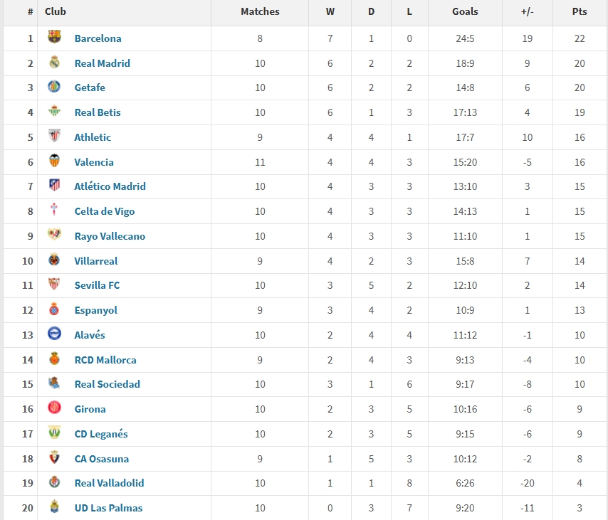 皇馬6勝2平2負積20分第二。馬競僅取得4勝3平3負積15分,位居第7。