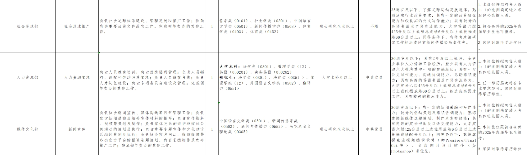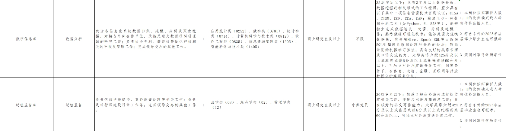 另外,綜合部(財務審核)、國家隊管理部(隊伍管理)、裁判部(裁判管理)、社會足球部(社會足球推廣)、媒體文化部(新聞宣傳)、數字信息部(數據分析)、紀檢監督部(紀檢監督)要求學歷為碩士研究生及以上,其余崗位為大學本科及以上。