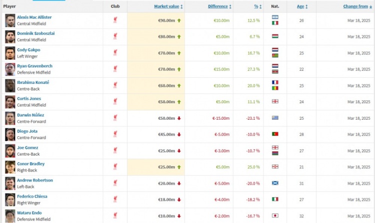 3月18日訊 德轉更新了部分英超球員身價,在此次更新中有13位利物浦球員身價發生了變化,其中6人出現下跌,7人出現上漲。