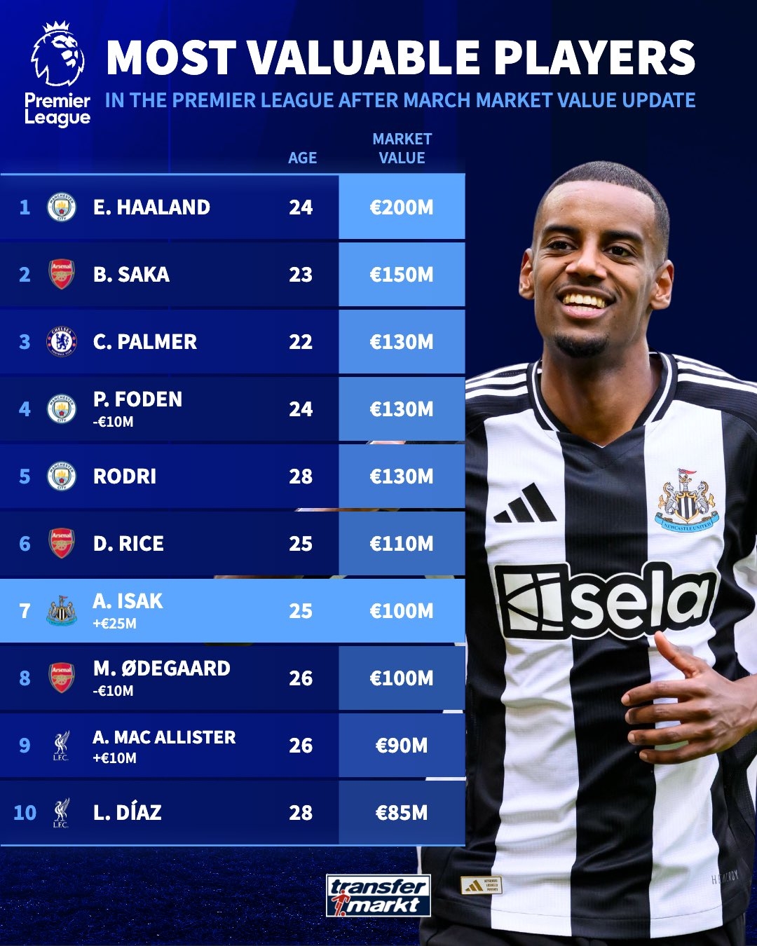 03月18日訊 德轉更新英超身價,前二哈蘭德、薩卡不變,多位利物浦球員身價增長,一些曼城、阿森納球員的身價小幅下跌,伊薩克、17歲恩瓦內里(本月21日將年滿18歲)的身價迎來暴漲。