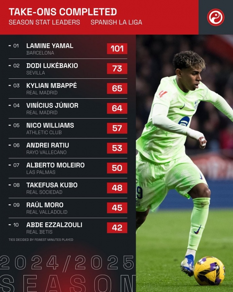 3月19日訊 國家隊比賽周到來,西甲也暫時告一段落,squakwa統計了本賽季西甲成功過人情況,亞馬爾斷崖領跑。