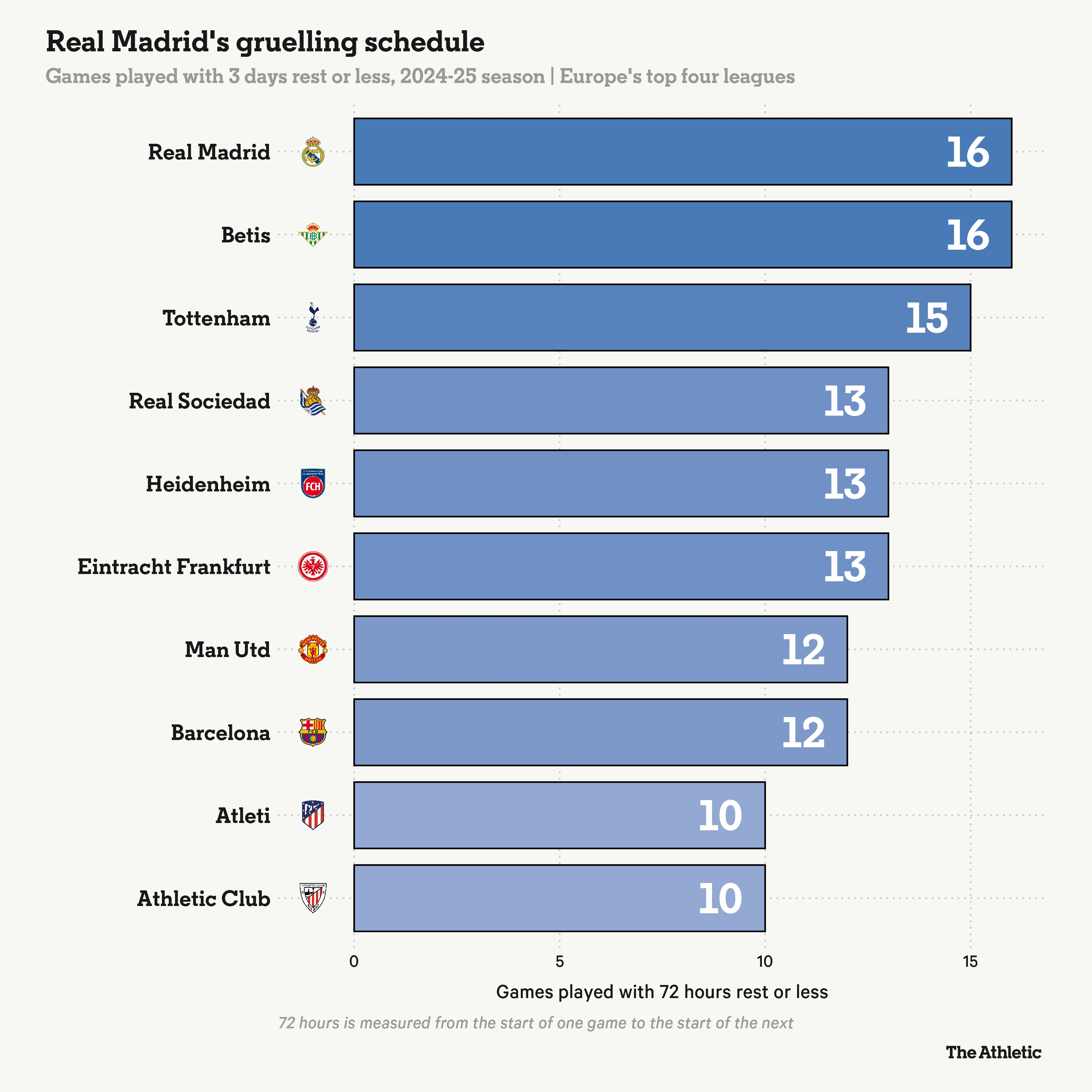 3月19日訊 根據The Athletic統計,皇馬本賽季有16場比賽休息不多于72個小時。