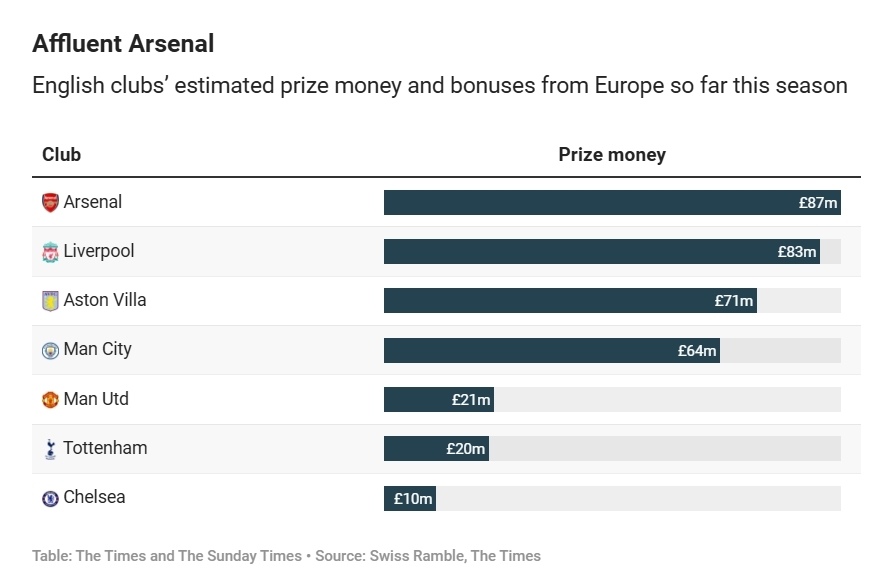 03月19日訊 泰晤士報統計了截至目前英超球隊在歐戰的預估收入和獎金。阿森納居首,利物浦次之,具體排名如下:1.阿森納 8700萬英鎊2.利物浦 8300萬英鎊3.阿斯頓維拉 7100萬英鎊4.曼城 6400萬英鎊5.曼聯 2100萬英鎊6.托特納姆熱刺 2000萬英鎊7.切爾西 1000萬英鎊 本文標簽: 足球 英超 曼聯 切爾西 阿森納 曼城 利物浦 熱刺