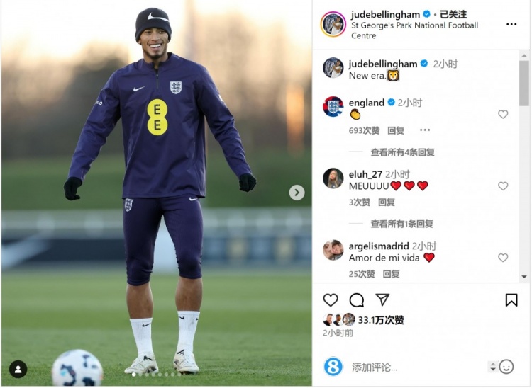 3月20日訊 貝林厄姆更新社媒動態,曬出在英格蘭隊訓練的照片。貝林厄姆隨英格蘭隊備戰世預賽,他在社交媒體上曬出訓練照片,并配文:“新時代????”英格蘭隊將在3月份參加兩場世預賽,分別對陣阿爾巴尼亞、拉脫維亞。 本文標簽: 足球 西甲 皇家馬德里 英格蘭