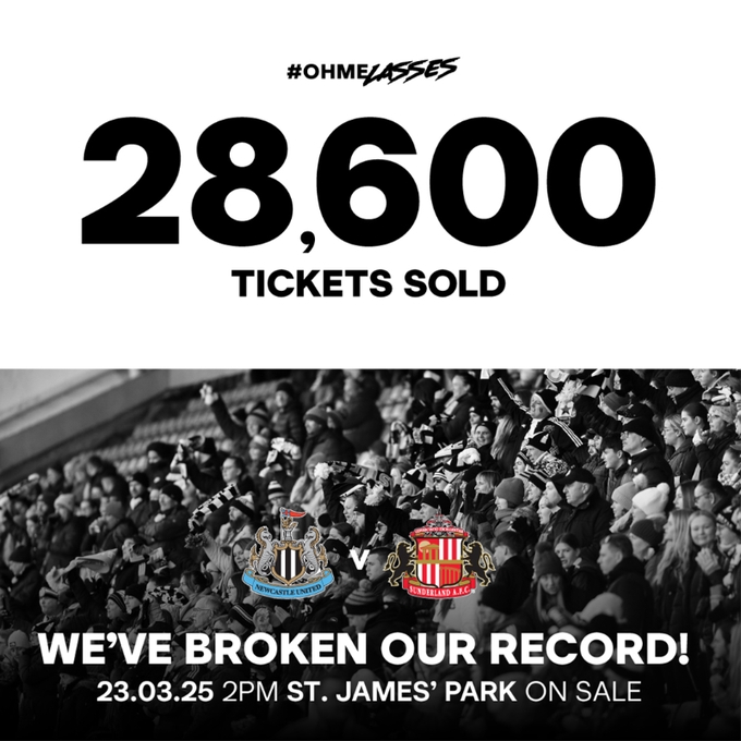 3月20日訊 紐卡女足官方發文,球隊在女足英冠主場迎戰桑德蘭女足的比賽售出28600張票,這創下了紐卡女足的隊史紀錄。