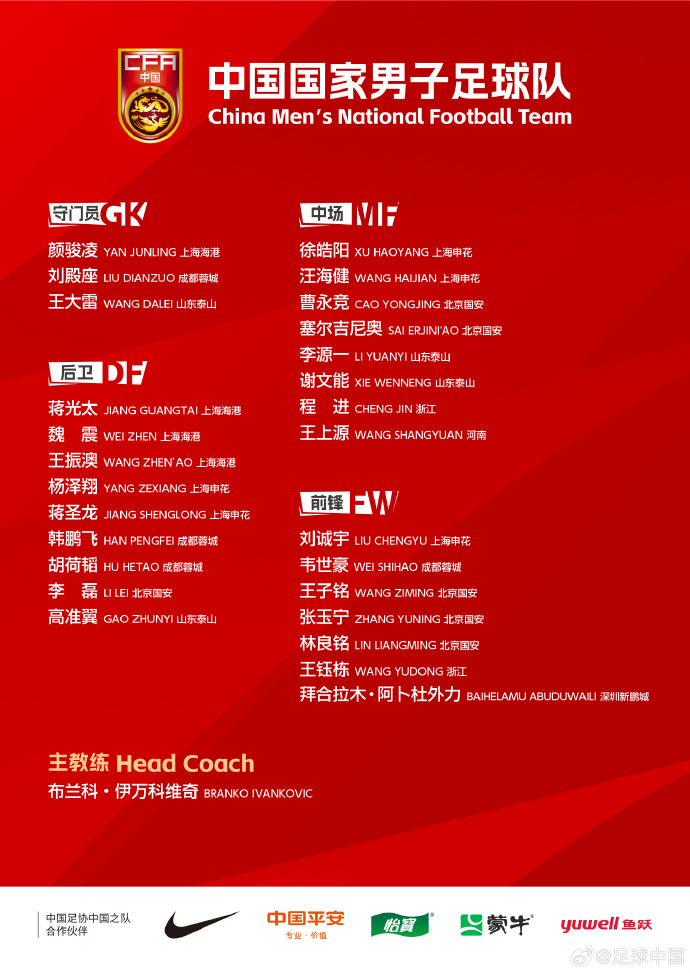 規則規定,中國隊本場比賽至多報名23名人。從相關訊息渠道獲知,根據球隊的訓練情況,落選球隊本場比賽報名陣容的4名很可能分別是來自國青前鋒王鈺棟、劉誠宇、中場球員程進、邊后衛王振澳,歸化新人塞爾吉尼奧確定入選。