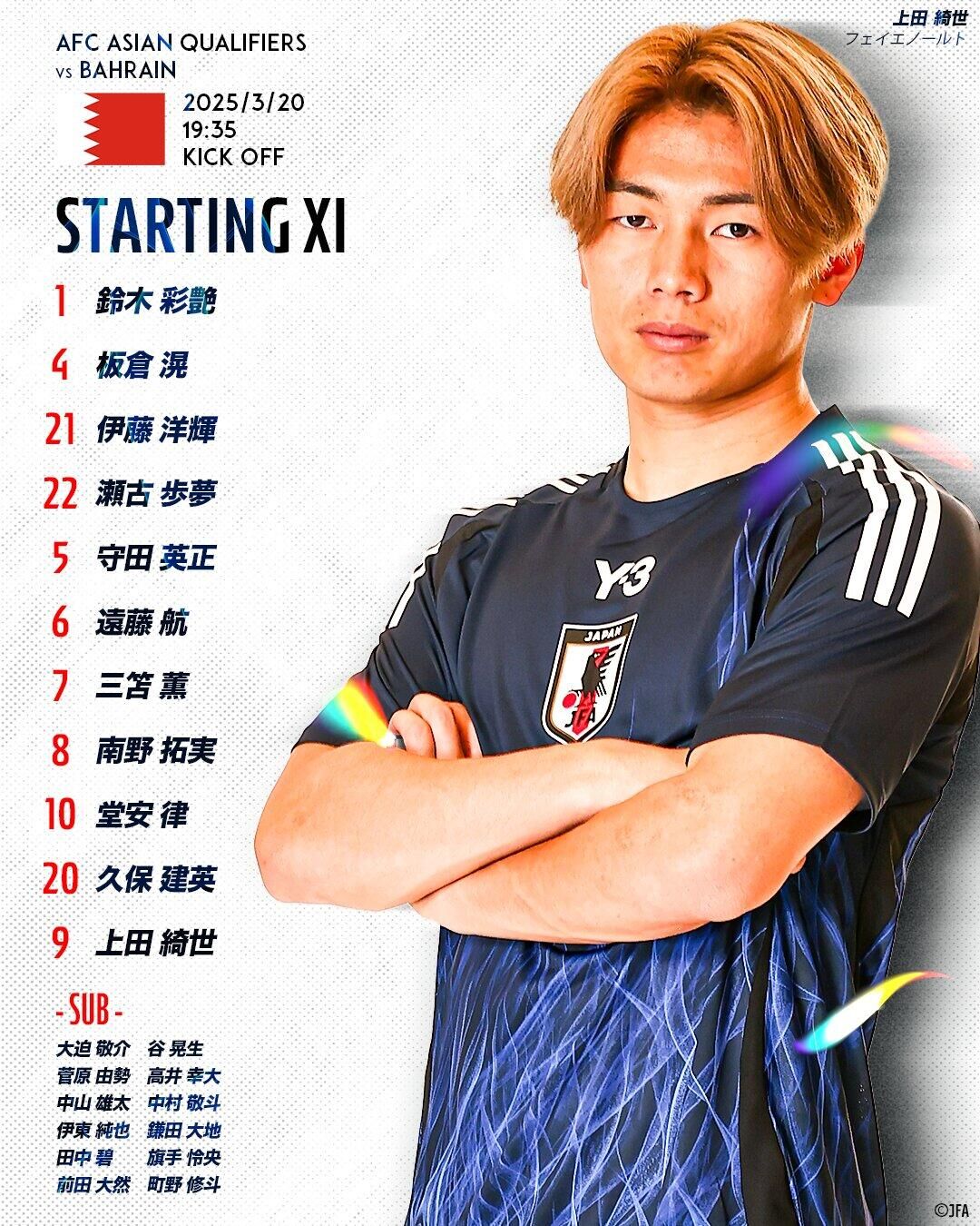 03月20日訊 北京時間18點35分,世預賽亞洲區第三階段C組第7輪,日本vs巴林,賽前雙方首發公布!本場比賽日本隊贏球即可提前晉級2026世界杯。