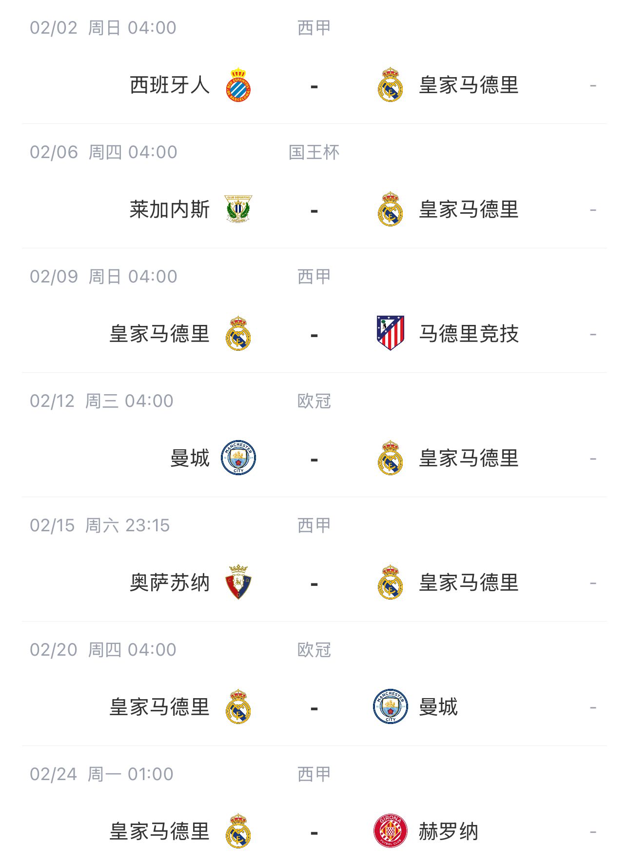 皇馬2月面臨賽程考驗(yàn),由于巴薩和馬競(jìng)直通歐冠16強(qiáng),皇馬比這兩位西甲爭(zhēng)冠對(duì)手多出兩場(chǎng)歐冠淘汰賽附加賽,而且附加賽對(duì)手還是曼城。