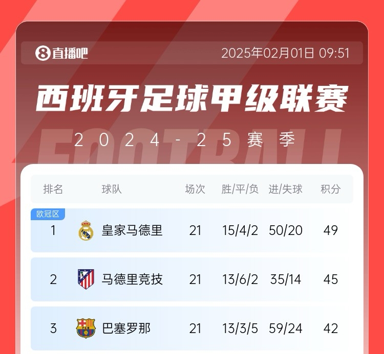 目前的西甲積分榜,皇馬49分居首,馬競(jìng)45分第二,巴薩42分第三。