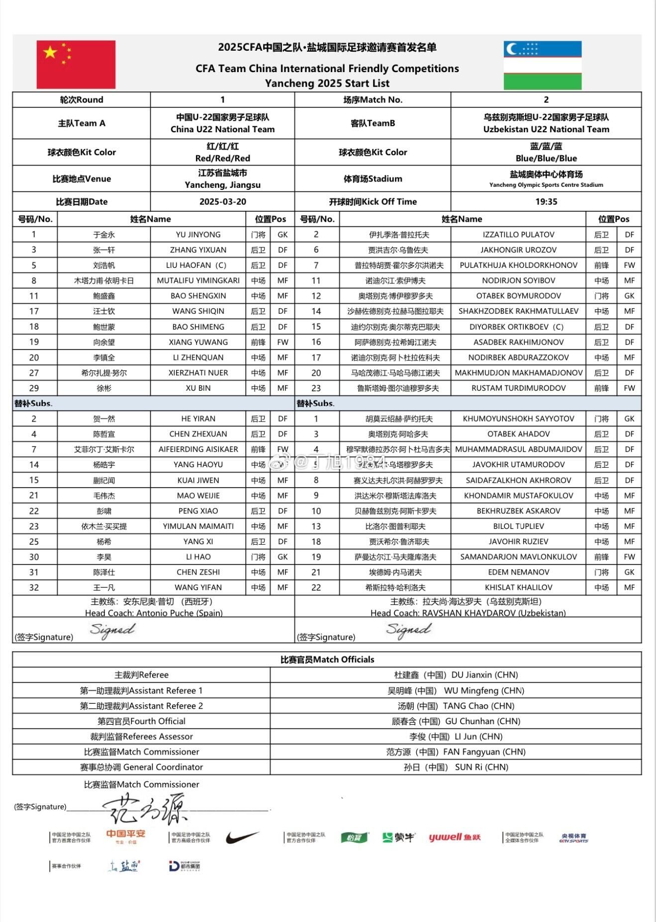 03月20日訊 2025CFA中國之隊·鹽城國際足球邀請賽,中國男足U22vs烏茲別克斯坦U22,賽前雙方首發公布!此前從國家隊集訓回歸的徐彬、汪士欽、劉浩帆先發出戰。