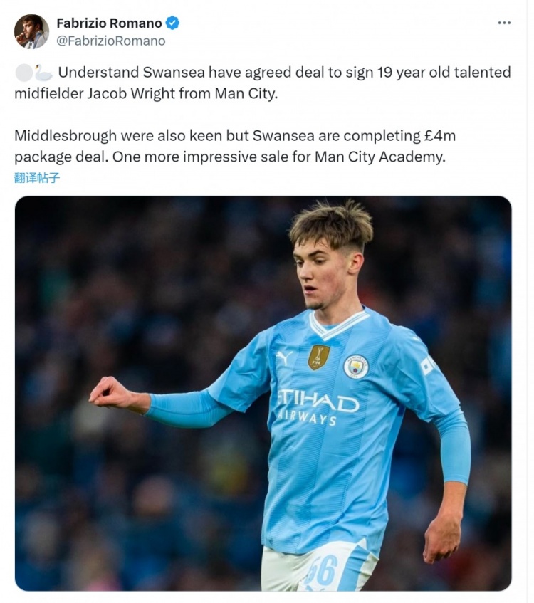 2月1日訊 據知名記者羅馬諾透露,斯旺西引進曼城19歲中場雅各布-賴特都達成協議。羅馬諾指出,斯旺西和米德爾斯堡都對雅各布-賴特感興趣,最終斯旺西在競爭中勝出,已與曼城就這位小將的轉會達成協議,轉會費400萬英鎊。雅各布-賴特效力于曼城U21梯隊,本賽季為曼城一線隊出場2次,在青年隊出場15次6球6助。 本文標簽: 足球 英超 曼城 轉會