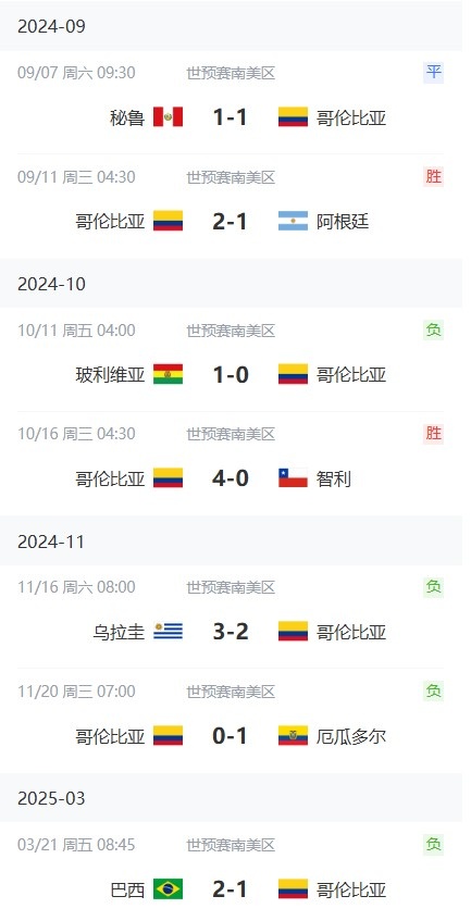 3月21日訊 在本輪南美區世預賽,哥倫比亞1-2不敵巴西。哥倫比亞在世預賽已經遭遇3連敗,而在其美洲杯決賽不敵阿根廷之后,球隊在近7場比賽只取得2勝1平4負。具體戰績如下: 本文標簽: 足球 國家隊 哥倫比亞