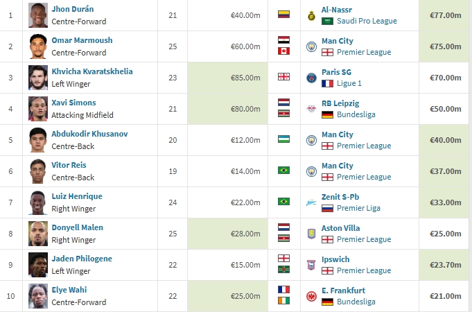 利雅得勝利官宣簽下杜蘭,杜蘭也以7700萬歐暫時(shí)成為今年冬窗標(biāo)王,前十曼城有3人入選。
